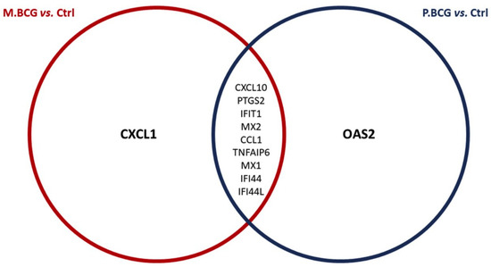 Venn diagram representing the differentiated genes within sets corresponding to the two IPA predictions. The intersections correspond to genes appearing in more than one prediction. Red circle: M.BCG vs. Ctrl; Blue circle: P.BCG vs Ctrl; M.BCG: Mycobacterium bovis Mexico; P.BCG: Mycobacterium bovis Phipps strain; Ctrl: control.