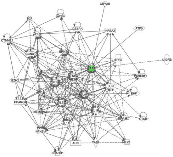 Network of tissue development, gene expression and cellular development related to M.BCG vs. P.BCG. Color codes: green, subexpressed. The color intensity indicates the degree of expression. Encoding form: rectangle—nuclear receptor ligand-dependent; oval—transcription regulator; rhombus—enzyme; circle—other.