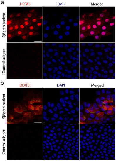 Previous observations by Coursey et al. found elevated levels of HSPA5 and sXBP1 in the conjunctival epithelium of Sjögren’s syndrome patients, which were linked to the presence of ER stress and the induction of the UPR in mucin-secreting goblet cells []. Our experiments confirmed the presence of HSPA5 in the conjunctival epithelium of Sjögren’s syndrome patients but, additionally, they showed the nuclear translocation of HSPA5 (Figure 1a and Supplementary Figure S1). We were not surprised by this observation because HSPA5 was previously localized to the nucleus following the induction of ER stress, when it might play a role against apoptotic events induced by DNA damage []. To gain further knowledge about the balance between survival and apoptosis signaling factors in Sjögren’s syndrome conjunctiva, we evaluated the expression of the pro-apoptotic factor DDIT3. In these experiments, we observed an accumulation of DDIT3 in conjunctival epithelial cells from pathological specimens compared to the control (Figure 1b and Supplementary Figure S1), indicating that severe ER stress and epithelial damage at the ocular surface of Sjögren’s syndrome patients is associated with the activation of the DDIT3 signaling pathway.