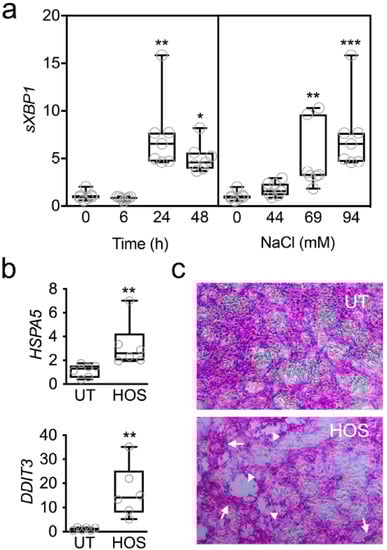 Hyperosmolarity induces the UPR in stratified human corneal epithelial cells. (a) Cell cultures exposed to sodium chloride were evaluated for time- and concentration-dependent changes in sXBP1 expression. qPCR experiments demonstrated significant upregulation of sXBP1 following addition of sodium chloride (94 mM) for 24–48 h and using 69–94 mM sodium chloride (for 24 h) (n = 7 independent experiments). (b) HSPA5 and DDIT3 mRNA were significantly upregulated by qPCR following exposure to HOS (94 mM NaCl, 24 h) compared to untreated (UT) cells (n = 6 independent experiments). (c) HOS led to the formation of areas with substantial cell loss (arrowheads) and the penetration of rose bengal into damaged cells with altered morphology (arrows). The box-and-whisker plots show the 25th and 75th percentiles (boxes), the median, and the minimum and maximum data values (whiskers). Significance was determined using the Kruskal–Wallis test followed by Dunn’s multiple comparison (a) or Mann–Whitney test (b). *, p < 0.05; **, p < 0.01; ***, p < 0.001.