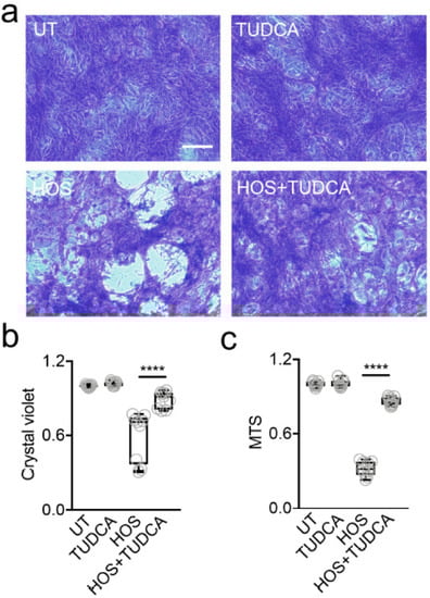 Accumulating evidence indicates that chemical chaperones can prevent ER-stress-associated programmed cell death after the prolonged activation of the UPR []. Therefore, we assessed whether supplementation with the chemical chaperone TUDCA could prevent the adverse effects of hyperosmolarity in stratified human corneal epithelial cells. In these experiments, we made use of crystal violet, a dye commonly used to assess viability in adherent cell culture models []. As expected, the exposure of the stratified cell cultures to HOS led to a clear loss of cell biomass (Figure 3a,b). On the other hand, the supplementation of the hyperosmotic culture media with 1 mM TUDCA resulted in a significant reduction in cell loss. These data were confirmed by measuring the cellular dehydrogenase activity with the MTS assay, an indicator of the number of viable cells in culture systems (Figure 3c).