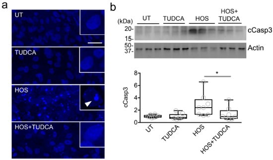We further assessed whether the supplementation with TUDCA was associated with a reduction in apoptotic events. First, we used DAPI staining to examine the chromatin condensation and fragmentation in the nuclei of the cells undergoing apoptosis, as previously reported []. We found that the stratified corneal epithelial cells not subjected to HOS were characterized by a homogeneous distribution of DAPI staining in their nuclei (Figure 4a). Conversely, the exposure to hyperosmotic saline led to increased DAPI intensity, corresponding to areas of chromatin condensation and fragmentation. Importantly, these alterations in nuclear morphology were greatly reduced in the presence of TUDCA. Second, we evaluated the activation of caspase-3, which requires cleavage into smaller subunits under apoptotic conditions and is activated under hyperosmotic conditions in human corneal epithelial cells, as a surrogate marker of ER-stress-associated programmed cell death [,,]. We found that HOS led to the increased cleavage of caspase-3, but that this effect could be significantly blocked by TUDCA supplementation (Figure 4b). These results strengthen the concept that TUDCA can enhance the survival of corneal epithelial cells via reductions in apoptosis.