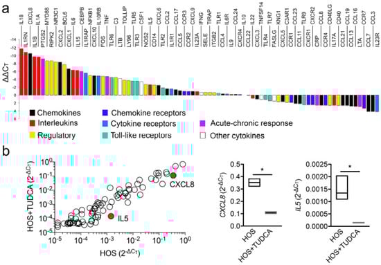 Tear hyperosmolarity damages the ocular surface epithelia both directly and indirectly, through a cascade of inflammatory events []. We used a PCR array to investigate the ability of TUDCA to modulate the expression of a focused panel of genes involved in the proinflammatory response following exposure to HOS. Consistent with previous reports, a direct comparison of the relative expression levels in epithelial cells exposed to HOS revealed that the most highly expressed genes included interleukins (IL1, IL5, IL6, and TNFα) and chemokines such as CXCL8 and CXCL10 (Figure 5a), which are commonly observed in patients with dry-eye disease []. Other genes that were prevalently expressed, and associated with the pathogenesis of dry eye, included the chemokine receptor CCR2 and the T-cell chemoattractant, CCL5. Two genes were found to be significantly downregulated in cell cultures incubated with TUDCA, including CXCL8, a neutrophil chemoattractant involved in the innate immune response, and IL5, a pleiotropic cytokine commonly associated with eosinophil survival (Figure 5b).