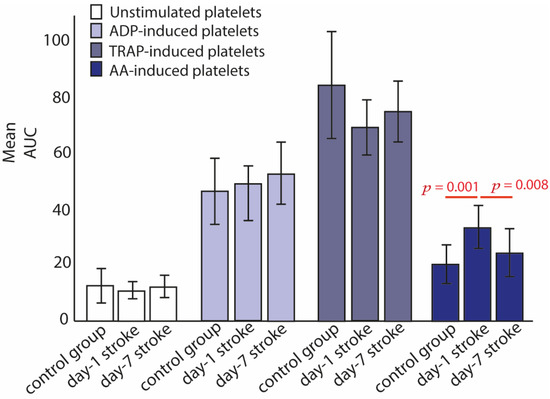 Platelet reactivity in blood in response to arachidonic acid (AA-test), adenosine diphosphate (ADP test), and thrombin receptor-activating peptide-6 (TRAP test). Unstimulated platelets (no agonist) were used as a negative control. p value was calculated with paired or unpaired t test, appropriately (Control samples n = 35, acute stroke day-1 samples n = 28 and stroke day-7 samples n = 20). Only statistical significant p values between the groups are shown (i.e., p ≤ 0.05). Abbreviations: AUC, area under the curve.