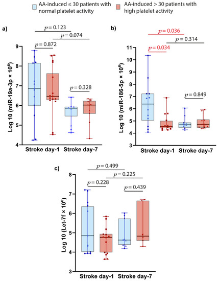 Patients with IS were divided into two subgroups as high and low platelet reactivity, based on baseline AA-induced platelet aggregation. Patients with ≤30 U AA-induced platelet aggregation was defined as normal platelet activation, and >30 U was defined as high platelet reactivity (HPR) [32]. Patients with normal platelet activation had significantly higher miR-186-5p expression levels compared to patients with HPR at day-1 acute-stroke (p = 0.034). Seven days after acute stroke, expression levels of miR-186-5p significantly decreased in the same patients with normal platelet reactivity (p = 0.036). No significant difference was observed for miR-19a-3p and let-7f (Figure 2).