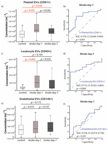 Patients with acute IS had significantly higher platelet-EVs (CD61+) concentration both at day-1 and day-7 post-stroke compared to control patients (p = 0.001, p = 0.030, respectively) (Figure 5a). Similarly, leukocyte-EVs (CD45+) was significantly higher in IS patients at day-1 compared to the control group (p = 0.005). No significant differences were observed for leukocyte-EVs concentration between control patients and patients at day-7 post-stroke (p = 0.104) (Figure 5c). No significant differences were found for endothelial-EVs concentration between control and patients at day-1 and day-7 post-stroke (p = 0.419, p = 0.737, respectively) (Figure 5e). Baseline concentration of both platelet-EVs and leukocyte-EVs showed diagnostic value for IS in the acute stage through ROC curve analysis. Area under the ROC curve for platelet-EVs was 0.776 (95% CI, 0.65–0.90) p = 0.001, whereas for leukocyte-EVs, it was 0.715 (95% CI, 0.57–0.87) p = 0.008 (Figure 5b,d).