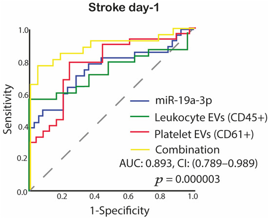 The ROC curve evaluates the diagnostic value of combined miRNA and EVs in the model in acute IS. ROC curves of the three significantly deregulated studied biomarkers (miR-19a-3p, leukocyte-EVs and platelet EVs) showed high diagnostic accuracy. Abbreviations: EVs, extracellular vesicles; miR, microRNA; p, value; AUC, area under the curve; CI, confidence interval; ROC, Receiver operating characteristic.