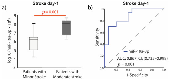 MiRNAs expression difference based on stroke severity at the day of stroke. (a) miR-19a-3p box plots; (b) miR-19a-3p ROC curves for prediction of stroke severity. The initial stroke severity as measured by the NIHSS at admission. Minor stroke: 1–4 (n = 15) and moderate stroke: 5–15 (n = 13). Abbreviations: log10, log10 transformation; miR, microRNA; p, value; AUC, area under the curve; CI, confidence interval; ROC, Receiver operating characteristic; NIHSS, National Institutes of Health Stroke Scale.