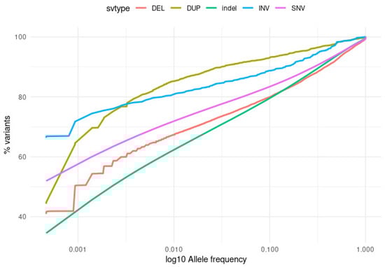 We compared the distributions of allele frequencies among different variant types, including substitutions, short indels, and high-quality structural variants. The results presented in Figure 2 and Table 1 indicate that the majority of substitutions (SNVs) (52%) were private variants, observed in a single individual (MAF ~0.05%). For large deletions and duplications, singletons constituted 41.9% and 44.8%, respectively, while the inversions constituted 67.1%. Among all analysed variant categories, singletons were the least abundant in indels, constituting 34.5% of all short insertions and deletions.