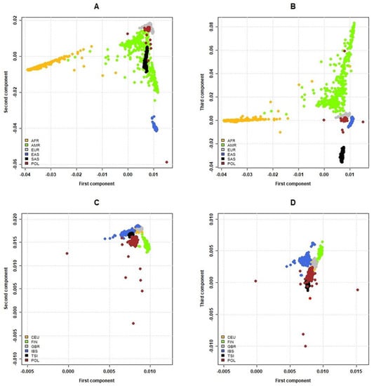 We evaluated the homogeneity of the Polish population (POL) using three steps. In the first step, we checked whether all analysed POL samples belonged to the European population. We used variants common between the Thousand Genomes Project (1000 G) and our cohort data. To minimise technical bias, we did not use original 1000 G variant files, but instead variants provided by Yun et al. (2021) [], obtained using the same version of the variant caller as in our project. The variants were pruned to MAF over 1% and to be in linkage equilibrium. In the second step, we performed a principal components analysis (PCA) on the 1000 G dataset and projected the data into POL genotype data. We trained a random forest model with the first six principal components (PCs) on the 1000 G dataset and predicted the ancestry of POL individuals. In the third step, in order to find out which European population is the closest to POL, we used the subpopulations information available in the 1000 G data set (Utah Residents (CEPH) with Northern and Western European ancestry (CEU), Finnish in Finland (FIN), British in England and Scotland (GBR), Iberian in Spain (IBS), Toscani in Italy (TSI)) and repeated the PCA and prediction based on random forest analyses as described above.