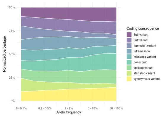 Comparison of exonic and non-exonic variant consequences across the allele frequency spectrum. As expected, variants with the largest impact on the encoded protein (e.g., start–stop, frameshift) were depleted among the common and enriched among the rare variation. On the opposite side, the relative abundance levels of non-exonic, UTR, and synonymous variants, which do not alter the amino acid sequence, increased with increasing variant population frequency.