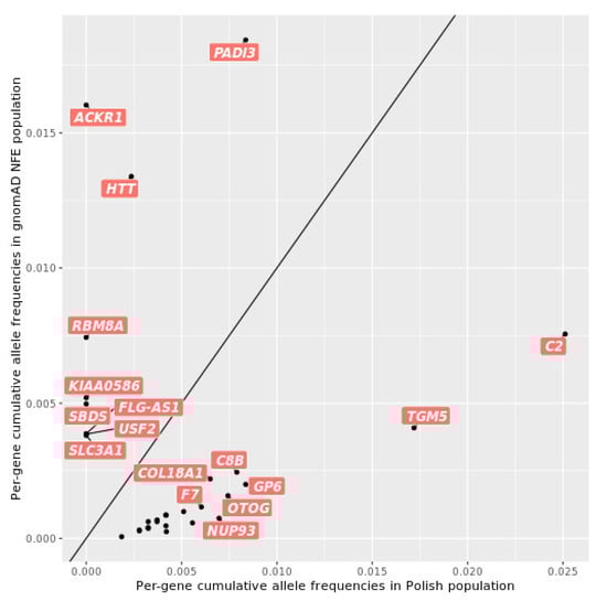 The sequencing data give a unique opportunity to interrogate rare variation. The rare alleles are considered relatively new in the population [] and they tend to cluster geographically more than the common alleles [,,], possibly giving rise to differences in inherited disease prevalence. Characteristics of runs of homozygosity in POL did not suggest increased risk of recessive diseases caused by homozygosity when compared to European population data [,]. However, we noted considerable differences in the frequencies of individual variants, and cumulatively in gene burden and gene panel analyses, when compared with non-Finish European populations. Variants in some of these genes were associated with the founder’s effect originating in Central Europe (e.g., TGM5 [], PROP1 [], C19orf1 [], DHCR7 [], NBN []), or reported before as frequent in the Polish population, e.g., rs80357906 in BRCA1 [], being a founder mutation in Ashkenazi Jews [,]. Others, despite showing considerable differences in frequency, have not been described before (e.g., ACKR1, C2, or MASP1). Further research is needed to investigate if this was due to a lack of comprehensible screening of these genes and phenotypes in the Polish population [], incomplete penetrance of the variants, or incorrect pathogenicity status in Clinvar. The latter cannot be excluded, as two variants in the top differing genes were removed from Clinvar since the release we used for variant annotation.
