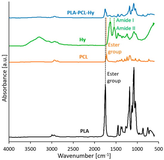 Fourier-transform-infrared (FTIR) analysis was carried out on dry samples by means of a Thermo Scientific, Nicolet iS50 FTIR spectrophotometer (Thermo Fisher Scientific, Madison, WI, USA) equipped with a PIKE MIRacle attenuated total reflectance attachment. The spectra were recorded over a range of 400–4000 cm−1 at a resolution of 4 cm−1. In order to evaluate the qualitative chemical composition of the materials before and after the hydrogel grafting, the test was carried out on PLA-PCL-Hy, on PLA-PCL and on starting PLA, PCL, and Hy.