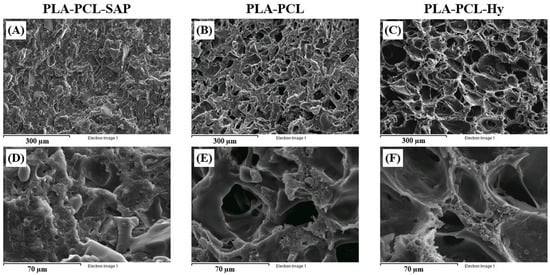 Morphological analysis of cryogenically obtained cross-sections for the PLA-PCL-SAP biocomposite material (A,D), for porous PLA-PCL (B,E) and for the core-shell assembly, PLA-PCL-Hy (C,F). Scale bars 300 µM (A–C) and 70 µM (D–F).