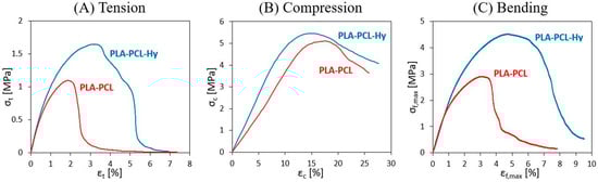 Stress vs. strain curves for specimens of PLA-PCL and PLA-PCL-Hy measures in (A) tensile, (B) compression, and (C) bending tests.
