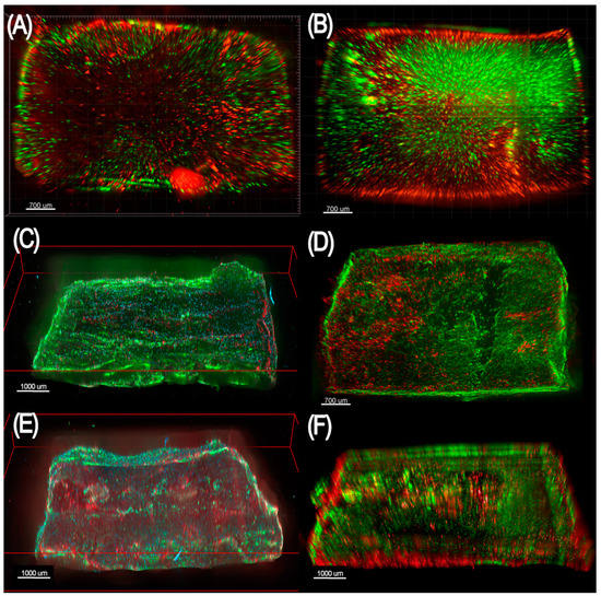 - In vitro vitality assay: the scaffolds were removed from the growth medium, stained with calcein (Invitrogen—Thermo Fisher Scientific, Waltham, MA, USA; green, live cells) and propidium iodide (Bioshop; red, dead cells), and scanned with a 2-channel epifluorescence microscope (red, green). The analysis was performed on day 4 and day 11 in PLA-PCL-Hy and hydrogel scaffolds seeded with 1000 cell/mm3 hBM-MSCs.