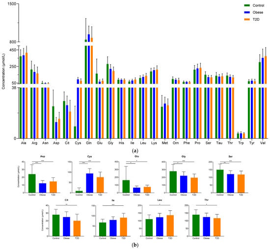 The serum concentration of examined amino acids: (a) The concentration of amino acids in serum. The y-axis shows the concentration in µmol/L of amino acids shown on the x-axis; (b) The concentration of amino acids showing statistically significant changes between the groups. The y-axis represents the concentration of individual amino acids, and the x-axis indicates the examined patient groups. * p-value ≤ 0.05; ** p-value ≤ 0.01; *** p-value ≤ 0.001. The green color refers to the control group, the blue color represents the obese group, and orange indicates the T2D group.