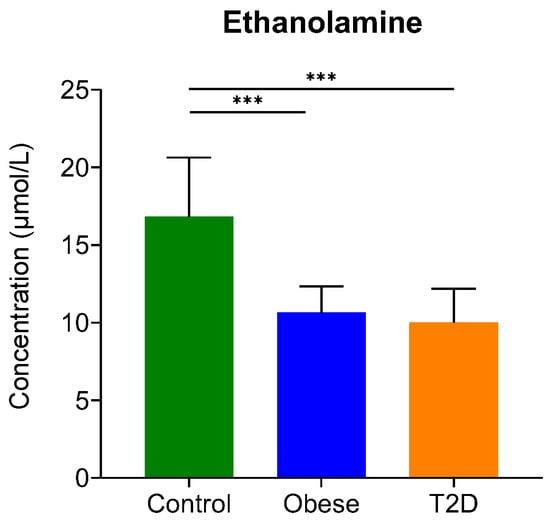 The serum concentration of ethanolamine. The y-axis represents the concentration in µmol/L of biogenic amine on the x-axis. ***, p-value ≤ 0.001. The green color refers to the control group, the blue color represents the obese group, and the orange indicates the T2D group.