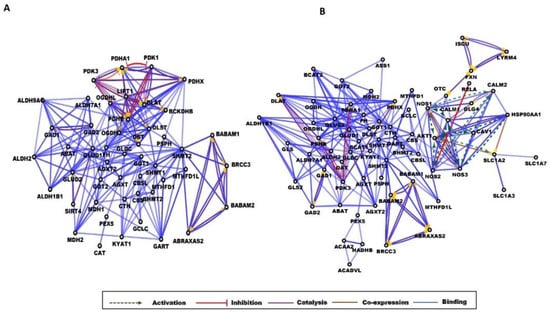 The metabolic pathways of each amino acid changes in a statistically significant manner between the control and either obese or T2D groups were considered, and the enzymes involved in the metabolism of these amino acids were retrieved. The transporters having a role in transmembrane transport of the respective amino acids were also retrieved, and a list of proteins was generated containing both the metabolic enzymes and the transporters modulating the levels of the selected amino acids. The first shell interactors of the enzymes and transporters were acquired using STRING DB [], and their protein–protein interaction networks were generated. To obtain functional information, the enriched GO terms were examined using the ClueGO v2.5.7 (Figure S1) and the gene interaction data of CluePedia v.1.5.7. (Figure S2).