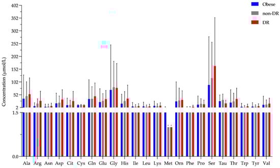 The concentration of amino acids in tear. The y-axis shows the concentration in μmol/L of all 23 amino acids shown on the x-axis. * shows amino acids that were detected but could not be quantified and an arbitrary value of 1 was assigned. Blue bars represent the obese group, the gray bar indicates the T2D group without diabetic retinopathy (non-DR), while the red bars represent the T2D group with diabetic retinopathy (DR).