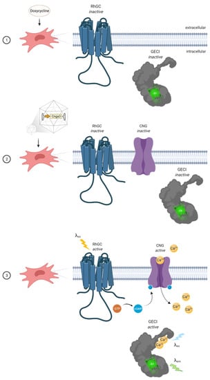 Schematic diagram showing the stepwise activation of the bioengineered cell system where (1) doxycycline induces the expression of rhodopsin guanylyl cyclase (RhGC) and genetically encoded calcium indicator (GECI) that remain inactive. (2) Transduction of the cells with AAV/CNGA3 leads to the expression of a homotetrameric cyclic nucleotide-gated (CNG) channel that remains closed in the absence of the ligand cyclic guanosine monophosphate (cGMP). (3) Illumination of cells at the RhGC excitation wavelength (λex) leads to cGMP production that binds and opens the CNG channel leading to a Ca2+ influx. When illuminated at λex, Ca2+-bound GECI emits a specific fluorescent signal (λem) that can be quantified by a fluorometric plate reader.