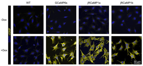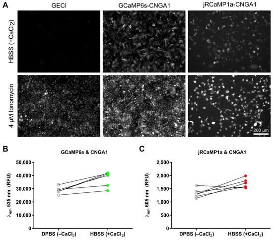 In order to test whether the three selected GECIs would detect Ca2+ under physiological conditions, the stable cell lines were exposed to increasing concentrations of doxycycline, i.e., 0.25, 0.5 and 1 μg/mL. After 48 h incubation, the Ca2+-free medium was replaced with Ca2+-containing medium (HBSS+CaCl2) and the cells were imaged using a fluorescence microscope with filters for GFP (λex 488, λem 510) and Texas Red (λex 596, λem 615). The signal obtained was comparable for all concentrations (Figure S1A), and therefore cells were treated with 0.5 μg/mL doxycycline for all subsequent experiments. As a positive control for GECI fluorescence when bound to Ca2+, the cells were treated with 4 μM ionomycin for 5 min, which led to the partial disruption of their cell membrane and an uncontrolled influx of Ca2+. By comparing the fluorescent images before and after ionomycin treatment, it was evident that the signal from GCaMP6s (Figure S1A) and jRCaMP1a (Figure S1B) differed the most between conditions, whereas that from jRCaMP1b (Figure S1C) did not. Therefore, the cells with jRCaMP1b were not used for further experiments because this poor sensitivity would fail to detect any CNG-borne changes in intracellular Ca2+.