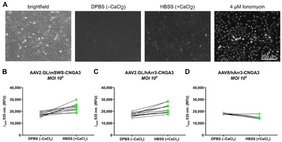 To assess whether our cell-based reporter could discriminate between vector potencies, three different AAV vectors expressing mouse or human CNGA3 were tested using the same experimental set-up as above. Vectors carried either a human hArr3-CNGA3 or a mouse mSWS-CNGA3 expression cassette and were packaged with either the engineered AAV2.GL [] or the conventional AAV8 capsid. All vectors were used at an MOI of 105, which was sufficient to increase the detected GCaMP6s signal in the presence of high extracellular Ca2+ (Figure 4A). Quantitative results confirmed the presence of a functional vector-borne CNG channel after transducing cells with AAV2.GL/mSWS-CNGA3 (Figure 4B) and AAV2.GL/hArr3-CNGA3 (Figure 4C), but not AAV8/hArr3-CNGA3 (Figure 4D), indicating that the vectors with AAV2.GL were more potent.