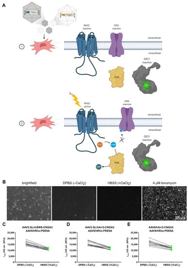 Adaptation of cell-reporter system to test AAVs with PDE6A cargo. (A) Schematic diagram outlining the predicted interaction of the cell-reporter system when (1) cells are co-transduced with AAV/CNGA3 and AAV/ PDE6A, leading to the expression of both the homotetrameric CNG channel and a partial PDE protein. RhGC illumination (2) leads to cGMP production that, instead of binding and activating the CNG, it becomes hydrolyzed by the PDE, thereby preventing Ca2+ influx and GECI signal. (B) Representative fluorescence images of GCaMP6s signal obtained from engineered HeLa cells after transduction with CNGA3- and PDE6A-expressing vectors in three conditions: in the absence of extracellular Ca2+ (DPBS−CaCl2), in high extracellular Ca2+ (HBSS+CaCl2), and positive control signal where cells are permeabilized with a 4 μM ionomycin solution. (C) Quantification of relative fluorescence units (RFU) at λem 535 nm of engineered HeLa cells co-transduced with AAV2.GL/mSWS-CNGA3 and AAV8/hRho-PDE6A in the absence of extracellular Ca2+ (DPBS−CaCl2) versus high extracellular Ca2+ (HBSS+CaCl2). (D,E) As in (C) for cells co-transduced with AAV2.GL/hArr3-CNGA3 & AAV8/hRho-PDE6A or AAV8/hArr3-CNGA3 & AAV8/hRho-PDE6A, respectively.