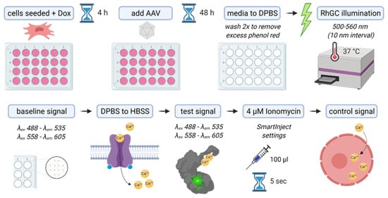 All illumination and fluorescence recordings were performed using the SpectraMax plate reader Multi-Mode Microplate Reader from Molecular Devices. The plate reader temperature was set at 37 °C before all recordings and the microinjector was loaded with an 8 μM ionomycin (I9657, Sigma-Aldrich) solution in HBSS+CaCl2 (14025092, Thermo Fisher). All recordings were performed in clear 24-well plates with signal reads performed from the bottom of the well with a high PMT and optics setting (Figure 6).