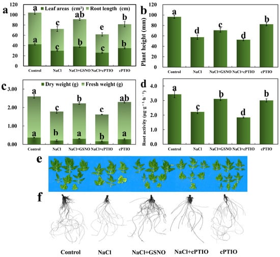 Effects of GSNO on phenotypic and physiological indexes of tomato seedlings during salt stress. (a) Leaf area and total root length. (b) Plant height. (c) Dry weight and fresh weight of the aboveground part of the plant. (d) Root activity. (e,f) Photographs were taken after 7 days of different treatments. The values (means ± SE) are the averages of three independent experiments (n = 15). Different letters mean significant difference by Duncan’s multiple range test (p < 0.05).