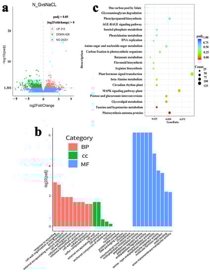 Transcriptome profiling analysis during NO alleviation of salt stress in tomato seedlings. (a) The number of DEGs is shown by the volcano plot. Red and green points represent up- and downregulated genes, respectively, and blue points represent no differences. (b) Functional gene ontology (GO) enrichment analysis of DEGs. GO terms are summarized in three categories: cellular component, molecular function, and biological process. (c) The DEG enrichment in different KEGG pathways. N_G: NaCl + GSNO; vs.: versus.