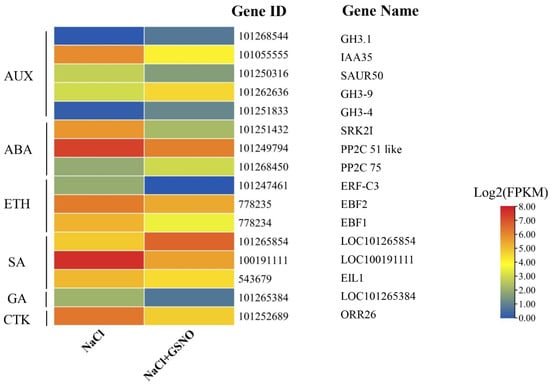 The heatmap of the expression of DEGs related to plant hormone signal transduction in NaCl and NaCl + GSNO treatments. The color scale corresponds to log 2-transformed (fragments per kilobyte per million reads) FPKM values. Red represents upregulation and blue represents downregulation of DEG expression.