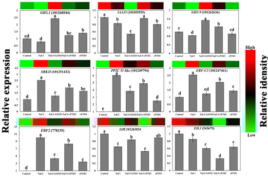 Quantitative real-time PCR analysis of the expression profiles of nine genes related to hormone signal transduction during NO alleviation of salt stress. The color scale corresponds to relative expression values of genes, with red indicating upregulation and green indicating downregulation. The error line is the standard error. Different letters mean significant difference by Duncan’s multiple range test (p < 0.05).