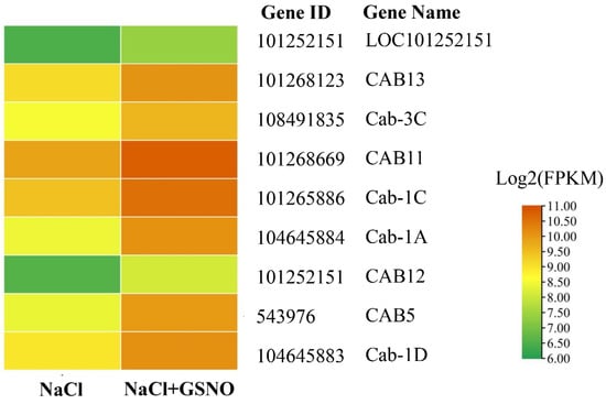 According to the KEGG results, nine significantly enriched DEGs in the photosynthesis antenna proteins pathway (sly00196) (Figure 5 and Table S6) were involved in the salt stress response. Among the nine DEGs, six genes were annotated as light-harvesting chlorophyll complexes of photosystem II (LHCII) of photosystem II (PSII), including genes encoding light-harvesting complex II, chlorophyll a/b binding protein 1 LHcb1 (chlorophyll a-b binding protein 1C (Cab-1C), Cab-3C, Cab-1A, and Cab-1D), LHcb3 (CAB13), and LHcb2 (CAB5). In addition, these six DEGs annotated as LHCIIs of PSII were significantly upregulated by GSNO + NaCl treatment compared with NaCl treatment alone. Furthermore, three DEGs, light-harvesting complex I, chlorophyll a/b binding protein 1 Lhca1 (LOC101252151), and LHca4 (CAB11 and CAB12), enriched in light-harvesting chlorophyll complexes of photosystem I (LHCI), were significantly upregulated after adding GSNO under stress.