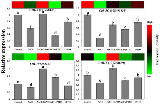 To verify the expression of DEGs, four photosynthesis-related genes were selected. As shown in Figure 6, the expression levels of CAB13, Cab-3C, LOC101252151, and CAB11 were decreased under NaCl stress compared with the control. Meanwhile, the expression of these genes under NaCl + GSNO treatment increased, showing about a one-fold increase in comparison with NaCl treatment alone. However, this increase was inhibited by cPTIO under salt stress compared with NaCl + GSNO treatment. In addition, cPTIO treatment alone also slightly decreased the expression level of these photosynthesis-related genes, implying that NO probably alleviated salt stress by regulating photosynthesis.