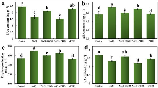 Changes in IAA, ABA, SA, and ethylene content during NO alleviation of salt stress. (a) IAA content, (b) ABA content, (c) ethylene content, (d) SA content. The values (means ± SE) are the averages of three independent experiments (n = 15). Bars not sharing the same letters indicate statistically significant differences by Duncan’s multiple range test (p < 0.05).