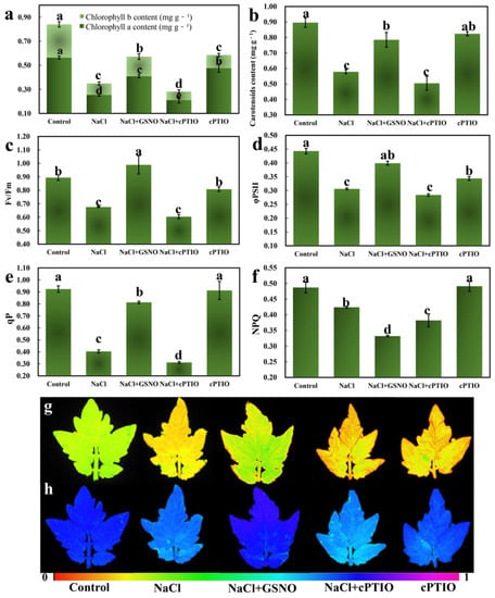 Changes in photosynthesis pigments during NO alleviation of salt stress. (a) Chlorophyll content, (b) carotenoid content, (c) maximum photochemical efficiency of PSII, (d) the quantum efficiency of PSII photochemical center, (e) the photochemical quenching coefficient, and (f) the non-photochemical quenching coefficient. (g,h) Images of Fv/Fm and ΦPSII, respectively. The values (means ± SE) are the averages of three independent experiments (n = 15). Bars not sharing the same letters indicate statistically significant differences by Duncan’s multiple range test (p < 0.05).