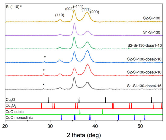 We carried out XRD studies for all samples deposited on silicon. The diffractograms clearly show that the samples consist of a single CuO phase. For peak identification, PDF card no. 01-080-1268, 01-080-0076, 00-005-0661, and 00-041-0254 were used. Before the analysis, the background and the contribution from the characteristic radiation Kα2 of the Cu anode were removed from the XRD patterns using the X’Pert HighScore software. The most intensive peaks are (111) and (−111) combined with (002), while the (110) peak is also seen (Figure 3). The ratio of intensities of these two most profound peaks changes with implantation, which may suggest the presence of texturization of thin films. For the samples implanted with a lower energy of 10 keV and with a larger dose of ions, the intensity of the (002) + (−111) peak decreases while the intensity of (111) + (200) increases. When comparing peaks of S2-Si-130 and S2-Si-130-dose3-10, this intensity ratio change is substantial, while when comparing peaks of S1-Si-130 and S1-Si-130-dose4-15, this change is much less visible. Implantation with higher energy, even with a higher dose, has less impact on film texturization.