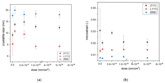 The crystallite size depends on their orientation. We observed that (−111) oriented crystallites (average size of around 7 nm) were smaller than (111) and (200) oriented crystallites, with an average size of 12 nm and 18 nm, respectively. The microstrain exhibits a different trend, the (−111) oriented crystallites demonstrate a larger strain than (002) crystallites but a smaller strain than (111). For all analyzed peaks, the crystallite size is the greatest for dose 2 of ion implantation, which is 5 × 1014 ions/cm2 at an energy of 10 keV. Comparing results responding to samples S1-Si-130-dose4-15 and S2-Si-dose3-10, it can be seen that both crystallite size and microstrain have almost the same values. This may suggest that the effect of a higher dose is diminished by the higher energy of ions.