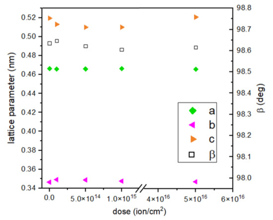The calculated lattice constant c and crystallographic angle β do not seem to change substantially with the dose of implantation. The c constant value decreases with an implantation of lower energy and increases for the most intensive implantation. An opposite trend can be seen in the case of the b constant, which increases its value for doses 1, 2, and 3 and decreases for dose 4 (Figure 5). When comparing two samples with the highest ion doses and different energies, it is clearly noticeable that the c parameter has a higher value for 15 keV implantation. This parameter value for samples implanted with 10 keV of energy of Cr ions falls with increasing implantation, so energy seems to be the deciding implantation parameter here.