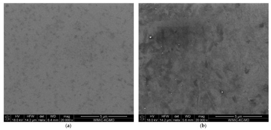 The SEM images of the ion-implanted samples shown in Figure 6 exhibit the granular structure of the films. The implanted sample (Figure 6b) has more dark areas visible, which indicates changes in the material and the possible presence of heavier elements, which in this case should be the implanted Cr.