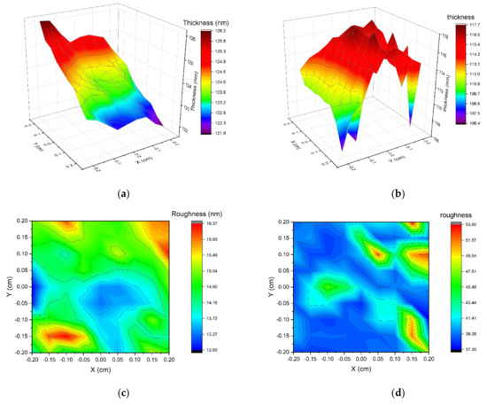Thickness and roughness of two samples calculated from ellipsometric measurements. (a) S2-Si-130 (no implantation) thickness, (b) S2-Si-130-dose3-10 sample (dose of ions 1 × 1015 ions/cm2), (c) S2-Si-130 roughness, (d) S2-Si-130-dose3-10 roughness.