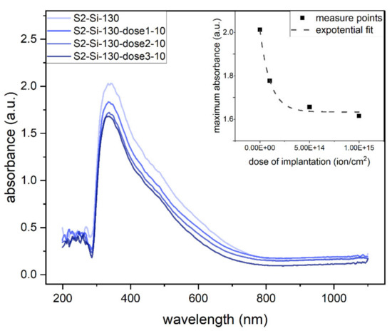 The absorbance measurements clearly show that the absorbance decreases roughly exponentially with an increase in implantation dose, as shown in the inset of Figure 9. The maximum absorbance of the oxide thin films is in the UV range (Figure 9).