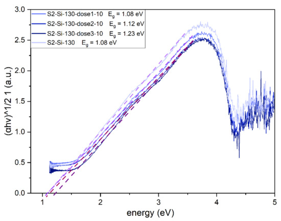 The implantation has an impact on the optical bandgap of the CuO material, which has a direct and dominating indirect bandgap [15]. The Tauc plot was created for an indirect allowed transition (γ = 2). Implantation with Cr ions increases the bandgap from 1.08 eV for a non-implanted sample to 1.23 eV for a sample implanted with the highest dose (Figure 10).