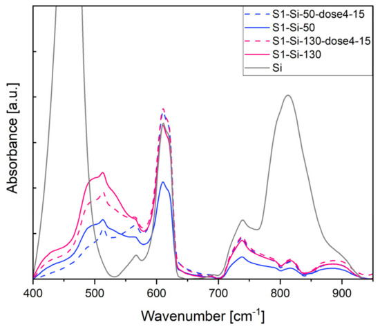 In Figure 11, the most pronounced band at 460 cm−1 comes from the Si substrate. A broadband around 500 cm−1 comes from the CuO structure and is a superposition of the following three IR active modes: Au 457 cm−1, Bu 503 cm−1, Bu 568 cm−1, as determined by Debbichi et al. [33]. After implantation, the intensity of these bands decreases.