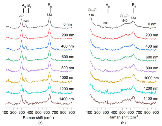 - Debbichi, L.; Marco De Lucas, M.C.; Pierson, J.F.; Krüger, P. Vibrational Properties of CuO and Cu4O3 from First-Principles Calculations, and Raman and Infrared Spectroscopy. J. Phys. Chem. C 2012, 116, 10232–10237. [Google Scholar] [CrossRef]