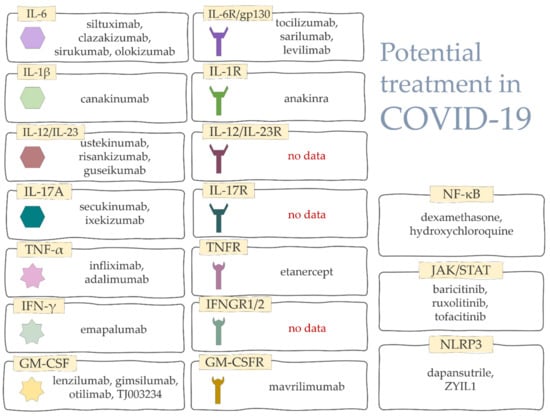 - Yang, L.; Xie, X.; Tu, Z.; Fu, J.; Xu, D.; Zhou, Y. The Signal Pathways and Treatment of Cytokine Storm in COVID-19. Signal Transduct. Target. Ther. 2021, 6, 255. [Google Scholar] [CrossRef]