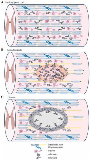 Schematic representation of the spinal cord in different phases: (A) healthy spinal cord; (B) acute/subacute injury phase (marked by cell necrosis originating from the spinal cord injury (SCI) and activation of inflammatory processes); (C) chronic phase (marked by cyst cavity formation and lesion expansion). Reprinted from an open-access source [].
