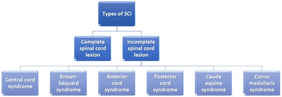 It is also essential to mention that the severity of the SCI depends on whether the lesion is complete or incomplete and, if it is incomplete, what part of the spinal cord is affected (Figure 2). In the case of a complete spinal cord lesion, there is no preservation of any motor and/or sensory function at more than three segments below injury level in the absence of spinal shock. On the other hand, incomplete spinal cord lesion patients preserve residual motor or sensory function to some extent at more than three segments below the level of the injury [,].