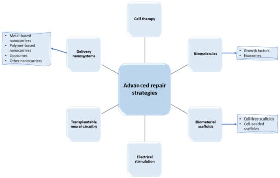 In their research efforts to find more performant treatment strategies for spinal cord regeneration, scientists have recently focused their works on a series of advanced repair strategies, as presented in Figure 3. Thus, the following subsections comprehensively describe each category of these approaches, with a particular focus on the developments of delivery nanosystems and biomaterial scaffolds.